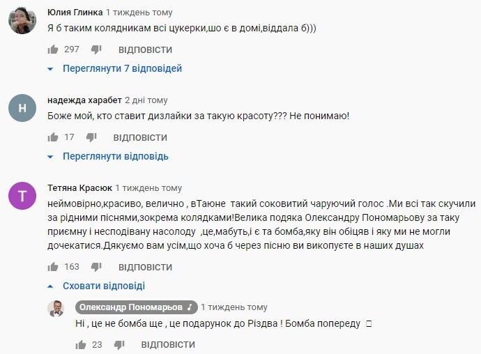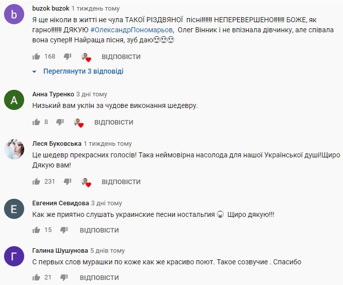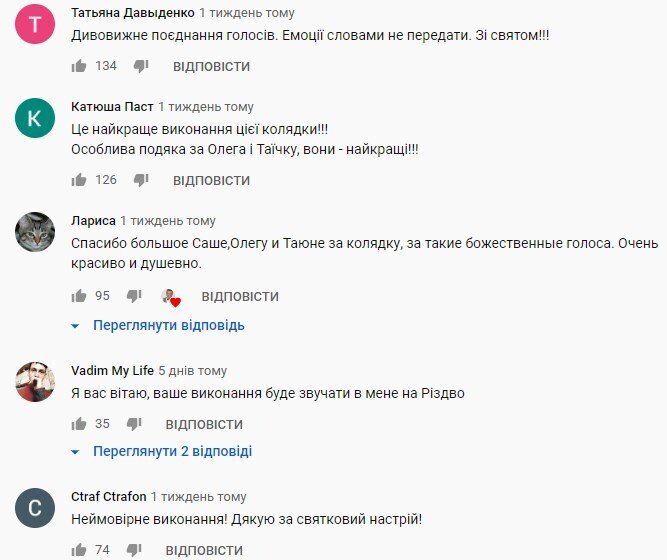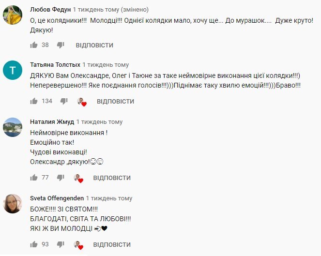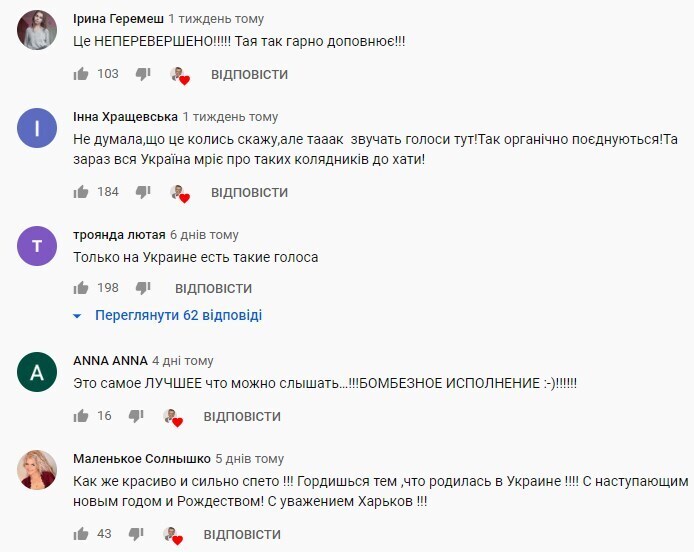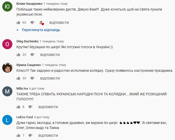 “Я би таким колядникам всі цукерки, що є в домі, віддала б!”, “Я ще ніколи в житті не чула ТАКОЇ різдвяної пісні, НЕПЕРЕВЕРШЕНО!”, “Це шедевр прекрасних голосів!”, “З перших слів мурашки по шкірі”, “Це найкраще виконання цієї колядки!”, “Божественні голоси!”, “Чудове поєднання фольклору та естрадної манери співу!” — не стримують своїх емоцій українці.