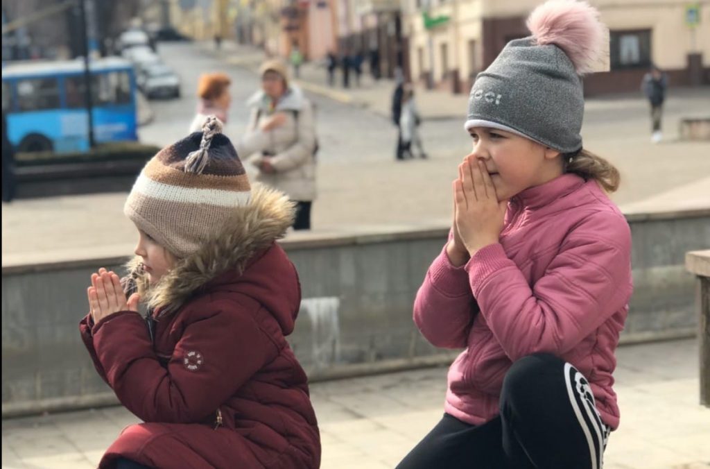 “Чернівці. Ці двоє маленьких дівчаток гралися на площі… Але почувши молитву за Гeроєм – прибігли і, вклякнувши на колінця, почали молитися…” – волонтерка